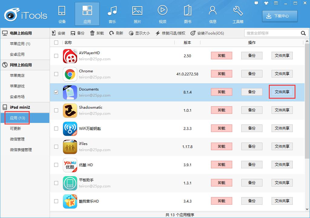 打開iTools,點擊【應用】,找到Documents或者iFils對應的“文件共享”按鈕并點擊進去: