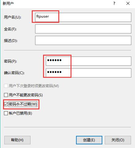 2. 輸入用戶名,自己隨便取,比如ftpuser,接著輸入密碼及確認密碼,去掉“用戶下次登錄時須更改密碼”的勾,選擇“密碼永不過期”,創(chuàng)建。