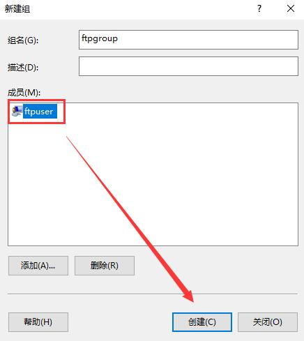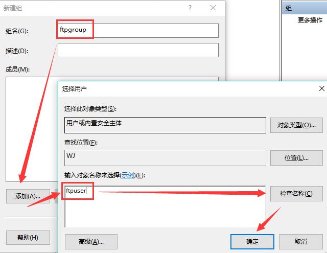 4. 取個組名,比如ftpgroup,之后選添加成員,把之前創(chuàng)建的ftpuser添加進來,選檢查名稱,之后確定。