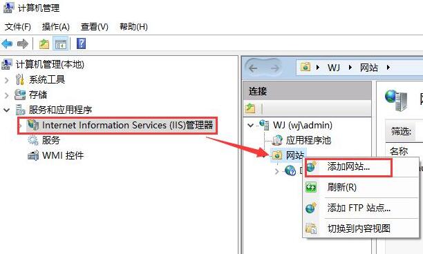 1. 右鍵我的電腦,管理→服務(wù)和應(yīng)用程序→IIS管理器,進入IIS設(shè)置,右鍵點擊網(wǎng)站→添加網(wǎng)站