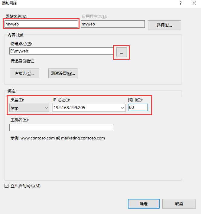 2. 給網(wǎng)站起個名字,比如myweb,選擇物理路徑(你需要存放資源的文件夾),綁定類型默認為http,在IP地址欄點擊下拉框后,系統(tǒng)會給出一個IP地址,選擇即可(每個人IP都不一樣,我的由于是本機,所以IP地址為局域網(wǎng)192段),http端口默認80,主機名就是域名,比如www.abc.com,如有則填上,否則不填,最后點確定。