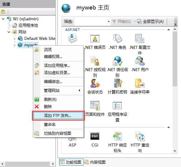 3. 右鍵點擊剛建立的網(wǎng)站myweb,選擇“添加FTP發(fā)布...”