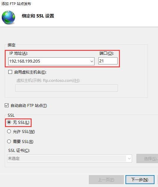 4. 同樣,點擊下拉框,選擇剛才選中的IP地址,端口默認21,虛擬主機名即ftp的域名,比如ftp.abc.com,如有則填上,否則不填,SSL選擇無SSL,之后點下一步。