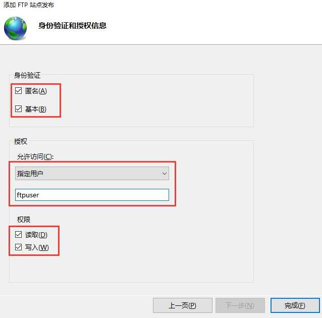 5. 身份驗證勾選 “匿名和基本”,允許訪問選擇“指定用戶”,框內(nèi)填第一步所建立的用戶名ftpuser,權(quán)限選擇“讀取寫入”,完成。